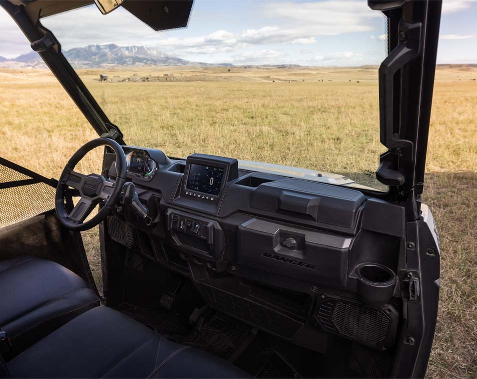 Center Mounted 7" Glove Touch Display with EV Infotainment (includes Range Remaining, Battery State of Charge, Charging Status, Launch Indicator, System Diagnostics and more), Speed Limiting, Plow Mode, Group Ride, GPS Navigation, Air Temp., Bluetooth, AM/FM Radio, Driver's Side Dual-sweep Analog Dials w/ 4" Multi-Color LCD Rider Information Center: Power Use and Regen %, Battery State of Charge %, Range Remaining, Charging Rate, Battery Temperature, Motor Temperature, Accessory Voltage, Speedometer, Odometer, Tripmeter, Gear Indicator, Service Indicator and Codes, Programmable Service Intervals, Seat Belt Reminder, User Selectable Backlighting & Brightness, Clock, Premium Cut & Sew Seats with Contoured Seatbacks and Embroidered Polaris Branding, Premium Steering Wheel and Interior Accents, Polaris Pulse Electrical System (6 position), DC Outlet, Dual USB Port, Cargo Box Located 12V SAE Port with In-Dash On/Off Switch, In Dash Speakers, Rear Camera, *Connectivity with Ride Command + App